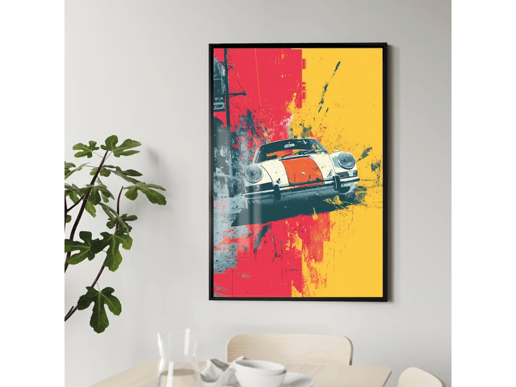 Tenhle poster od For The Speed není jen dekorace – je to pocta době, kdy volant drželi chlapi s koulema a auta měla duši. Klasická silueta sportovního kupé proráží abstraktní výbuch barev, jako by právě trhala asfalt na horském úseku Monte Carla nebo Passo Stelvio.
