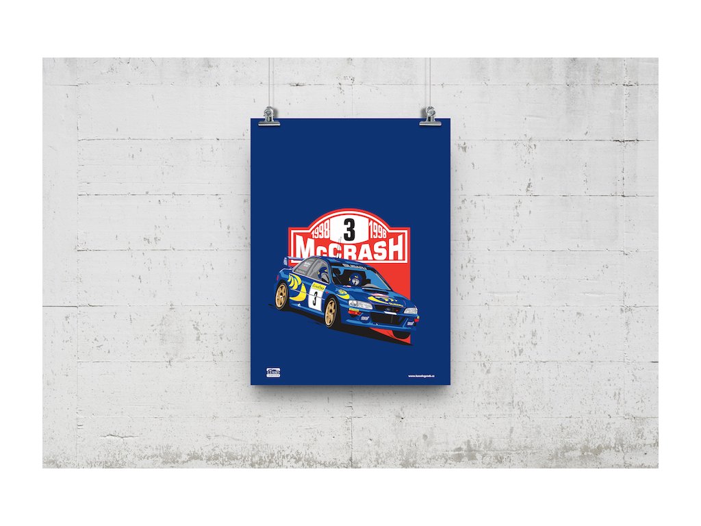 Věnec nebo kotrmelec, flatout. Legendární Colin McRae na posteru Lusso Legends se svým Subaru jako McCrash.